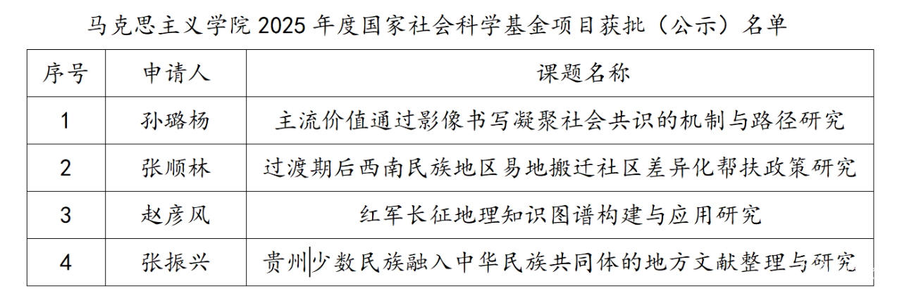 9月5日,全国哲学社会科学工作办公室公示了2025年国家社会科学基金年度项目立项名单,我们永利集团304官网3项国家社科基金年度项目喜获立项公示,分别是孙璐杨老师的《主流价值通过影像书写凝聚社会共识的机制与路径研究》、张顺林老师的《过渡期后西南民族地区易...