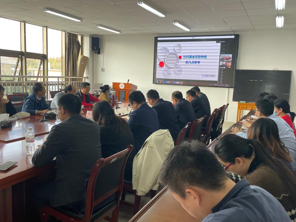 本次活动以启慧讲堂系列讲座为契机,邀请广西大学君武学者特聘教授、博士生导师吴家庆为我们教师进行了“社科基金项目申报的几点思考”主题讲座。吴教授从国家社科基金的类型、申报要求、申报书的撰写要点等方面进行了深入细致的讲解。讲座结束后,吴教授就我们部分教师在国家社科基金项目申报过程中的问题和疑惑进行了充分的解答。